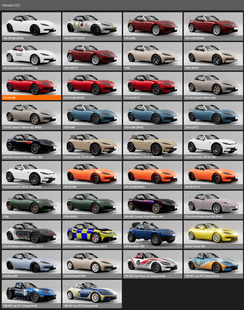 Мод имеет около 12 колес, 26 цветов кузова, отличных от Procyon, и 10 цветов интерьера. Он также имеет 38 конфигураций по умолчанию с дополнительными частями, позволяющими вам создавать свои собственные.