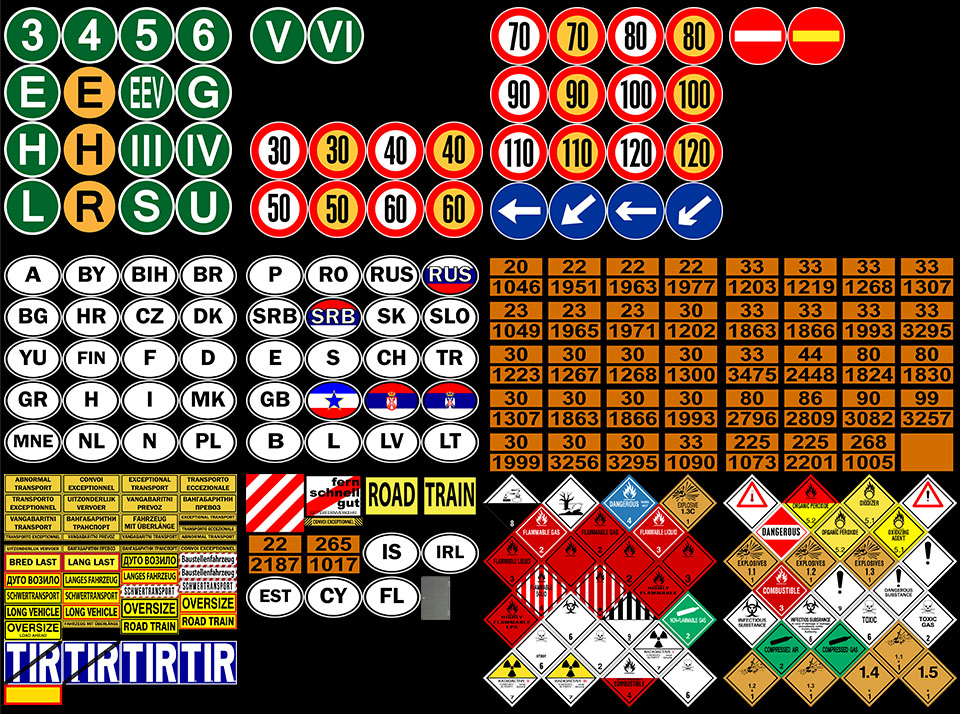 Мод представлен более чем 376 знаками, обозначающими грузовики в разных категориях кодов стран, ограничение скорости, предупреждение, предупреждение об экологии и другие. 3, 4, 5, 6, E, E (рыж), EEV, G, H, H (рыж), IV, L, S, U, III, V, VI, R (рыж), TIR, No TIR, T.I.R., No T.I.R. и т.д. ADR, 22-1951 Argon Refrigerated Liquid, 22-1977 Liquid Nitrogen, 22-2187 Carbon Dioxide Refrigerated Liquid, 23-1965 Liquefied Petroleum Gas LPG, 23-1971 Methane Compressed or Natural Gas Compresed With High Methane Content, 30-1202 Diesel, 30-1223 Kerosene, 30-1267 Crude Oil, 30-1300 Turpentine Substitute, 30-1863 Fuel Aviation Turbine Engine, 30-1999 Tars Liquid Including Road Oils And Cutback Bitumens, 33-1090 Acetone, 33-1203 Gasoline, 33-1219 Isopropanol (Isopropyl Alcohol), 44-2448 Sulphur Molten, 80-1824 Sodium Hydroxide Solution, 80-1830 Sulphuric Acid, 80-2796 Sulphuric Acid (with Not More Than 51% Acid), 86-2809 Mercury, 225-1073 Oxygen Refrigerated Liquid, 225-2201 Nitrous Oxide, 90-3082 Environmentally Hazardous Substance Liquid, Dangerous For The Environment, Flammable Materials, Flammable Materials 2, Flammable Materials 3, Flammable Solid Miscellaneous Goods, Hazard Class 9 Material, Radioactive 1, 2, 3, 30-1866 Resin Solution Flammable, 33-1866 Resin Solution Flammable, 30-1307 Xylenes, 33-1307 Xylenes, Infectious Material, Toxic Gases, Toxic Material, Corrosive Material, 99-3257 Elevated Temperature Liquid N.O.S. и т.д. 30, 40, 50, 60, 70, 80, 90, 100, 110, 120. Сочетание красно-белых и красно-желтых. Австрия, Беларусь, Бельгия, Босния и Герцеговина, Болгария, Хорватия, Кипр, Чешская Республика, Дания, Бывшая Югославия, Эстония, Франция, Германия, Греция, Венгрия, Лихтенштейн, Литва, Люксембург, Македония, Черногория, Нидерланды, Норвегия, Польша, Португалия, Румыния, Россия, Сербия, Словакия, Словения, Испания, Швейцария, Турция, Великобритания и т.д. Для DAF XF, DAF XF Euro6, IVECO HIWAY, IVECO STRALIS, MAN TGX, MERCEDES ACTROS 2009, MERCEDES ACTROS 2014, RENAULT PREMIUM, RENAULT MAGNUM, SCANIA RCAB 2009, SCANIA STREAMLINE, VOLVO FH 2009, VOLVO FH 2012. Changelog v1.0.99.08 ---> v1.1.00: - добавлен огнетушитель для грузовых автомобилей: Daf XF, Daf XF EuroURO 6, Iveco Stralis, Iveco Hi-Way, Man TGX, Mercedes Actros 2009, Mercedes Actros 2014 Volvo FH 16 2012 Добавлен огнетушитель для грузовых автомобилей Man TGX Euro 6 Автор мода: tobrago |