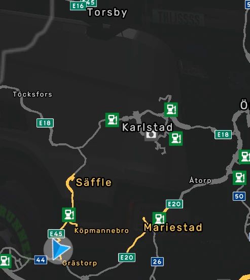 - Säffle - Köpmannebro - Grästorp - Mariestad - Åtorp - Töcksfors - Torsby