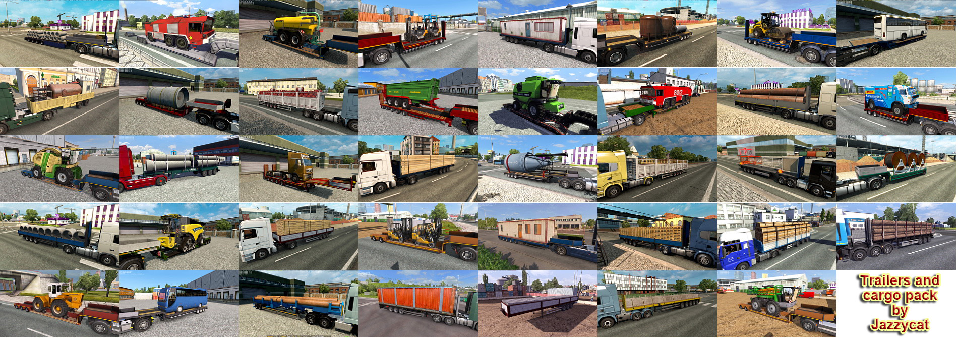 Пак добавляет в игру новые прицепы (Kögel, Fliegl, Böse, Närko, Lamberet, Chereau, Schmitz, Bodex, Wielton, D-Tec, Fruehauf, Schwarzmüller, Kassbohrer, Rolfo, Samro, Krone, Pacton, Ekeri, Goldhofer, Kröger, Aydeniz, Nooteboom, Sommer, NTM, HRD, Estepe, Fontaine, McLendon, Krampe, Kotte, Panav, Kempf, Langendorf, Galtrailer, Michieletto, Groenewegen, ЧМЗАП, МАЗ, НЕФАЗ, СЗАП, ТОНАР, ОДАЗ, Бецема и другие) и новые грузы. Для русской версии в папке мод должны быть три файла: Версия 6.7 - добавлен новый прицеп-низкорамник, новые грузы, новые прицепы в траффик, изменены прицепы для некоторых грузов Автор мода: Jazzycat |