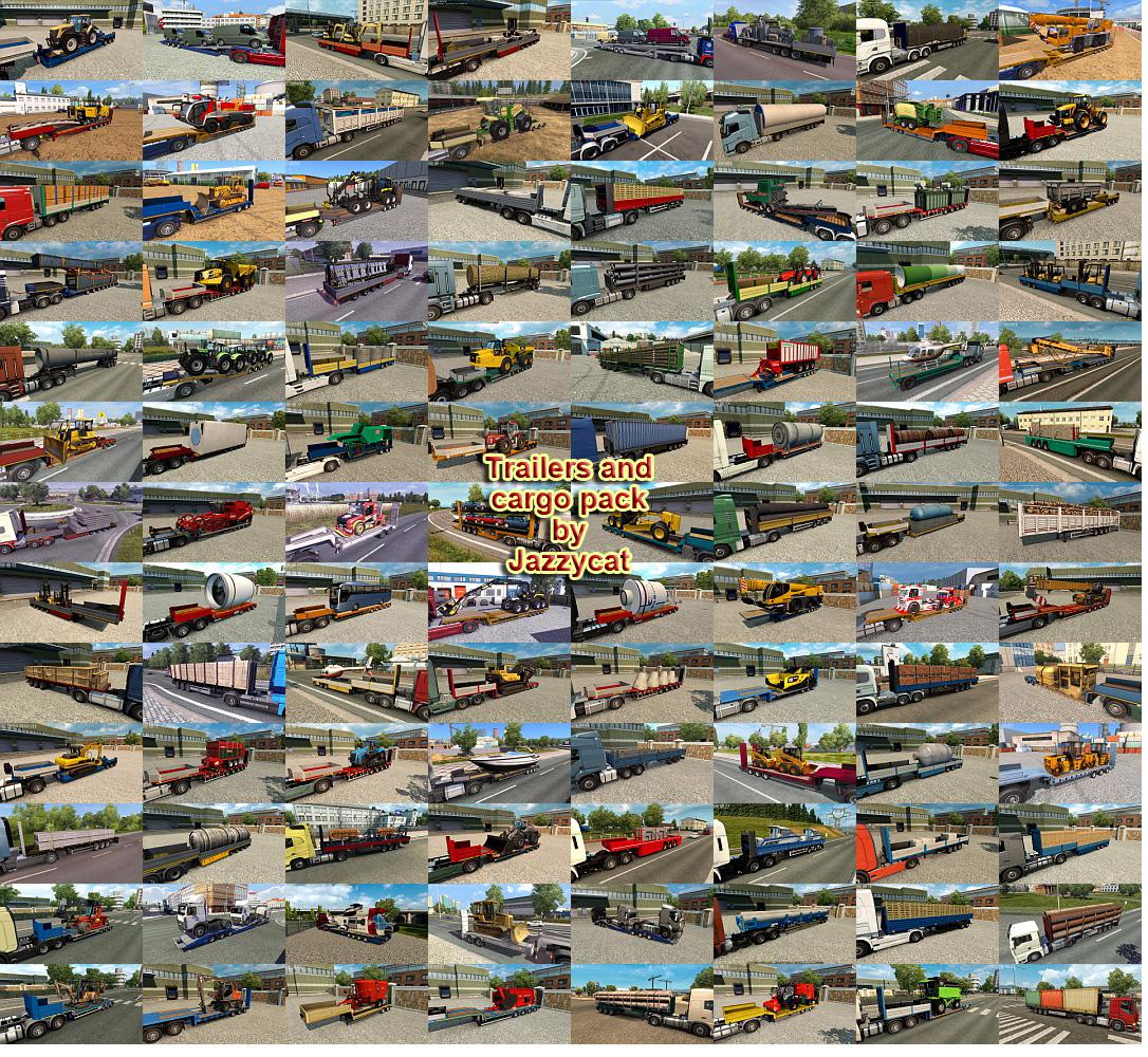 Пак добавляет в игру новые прицепы (Kögel, Fliegl, Böse, Närko, Lamberet, Chereau, Schmitz, Bodex, Wielton, D-Tec, Fruehauf, Schwarzmüller, Kassbohrer, Rolfo, Samro, Krone, Pacton, Ekeri, Goldhofer, Kröger, Aydeniz, Nooteboom, Sommer, NTM, HRD, Estepe, Fontaine, McLendon, Krampe, Kotte, Panav, Kempf, Langendorf, Galtrailer, Michieletto, Groenewegen, ЧМЗАП, МАЗ, НЕФАЗ, СЗАП, ТОНАР, ОДАЗ, Бецема и другие) и новые грузы. Версия 8.3 - добавлено около 100 новых скинов для большего разнообразия в компаниях из последних DLC Автор мода: Jazzycat |