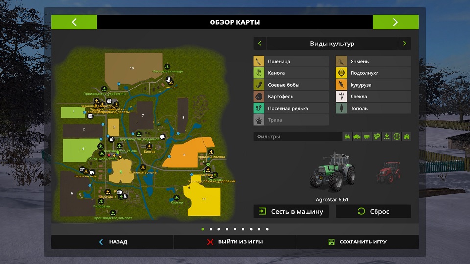 Измененная версия карты "Бухалово". На карте: - 12 полей; - Стандартные культуры; - Молокозавод; - Карьер; - Пилорама; - БГА: - Элеватор; - Овощебаза; - Присутствуют точки продажи; - Присутствует автомобильный и пешеходный трафик; - Присутствует грязь; - Поддержка мода "Сезоны".