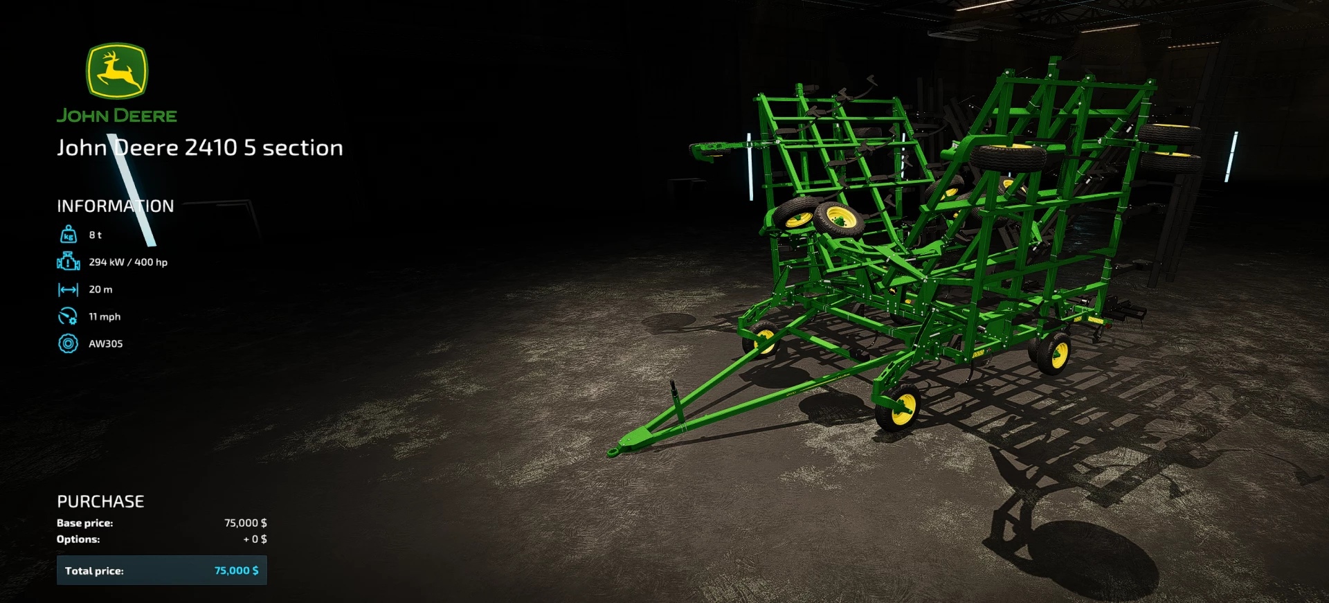 Культиватор John Deere 2410 5 секций Необходимая мощность 400 л.с. Рабочая ширина 20 м. Рабочая скорость 18 км/ч Цена 75000 евро Лог чист!