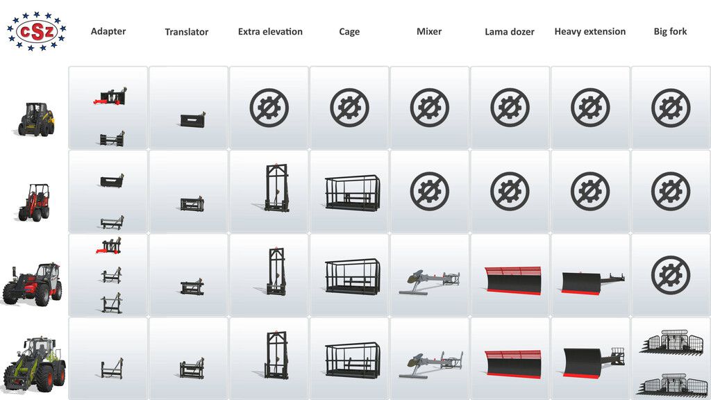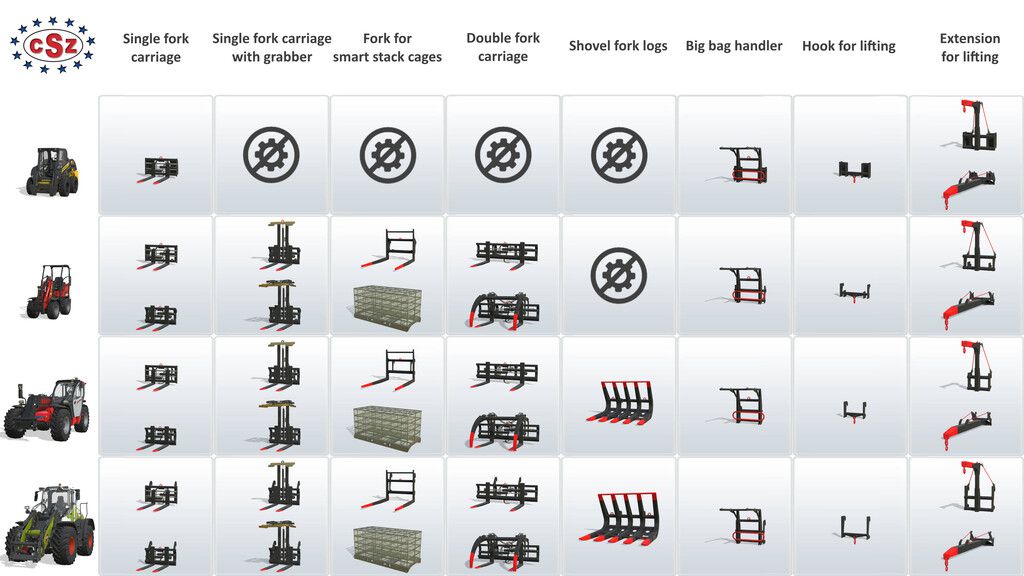 CSZ Pack содержит оборудование для тракторов, фронтальных погрузчиков, погрузчиков с бортовым поворотом, телескопических погрузчиков и колесных погрузчиков для Farming Simulator 22.