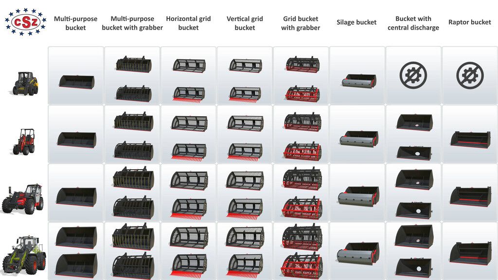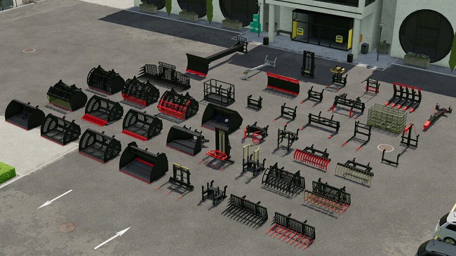 В паке следующее оборудование: силосный ковш, ковш для картофеля и свеклы, обычный ковш, ковш с захватом, ковш для раптора, ковш с центральным выбросом, вилы для тюков, вилы для навоза, вилы с захватом, большие вилы, вилы для обернутых тюков, вилы для откусывания , захват для биг-бэгов, удлинитель, клетка, адаптеры, переводчик, дополнительный подъем, вилы для поддонов, каретка вил для интеллектуальных клетей для штабелей, вилы для поддонов с захватом, двойные вилы для поддонов, вилы для бревен, лопата для бревен, крюк для подъема, рычаг для подъемник, удлинитель для подъема, скрепер, бульдозерный отвал, бульдозерный отвал с удлинителем и мешалкой.