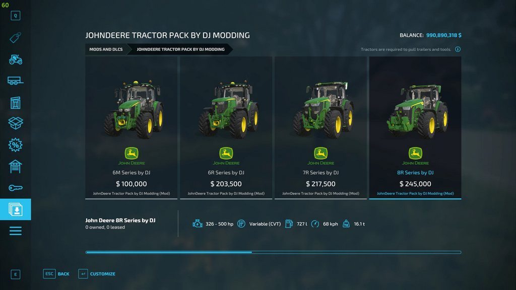 Пакет тракторов John Deere от DJ Modding Цена снижена с оригинала Увеличенная мощность двигателя Увеличена максимальная скорость: 68 км / ч. Добавлен многоцветный режим для колесных дисков и тракторов. Для всех тракторов JD базовой игры.
