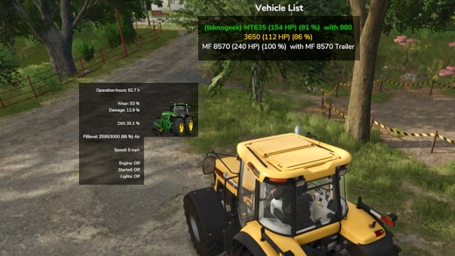 - Разные цвета в списке, если транспортное средство выбрано или в данный момент используется помощником/Courseplay