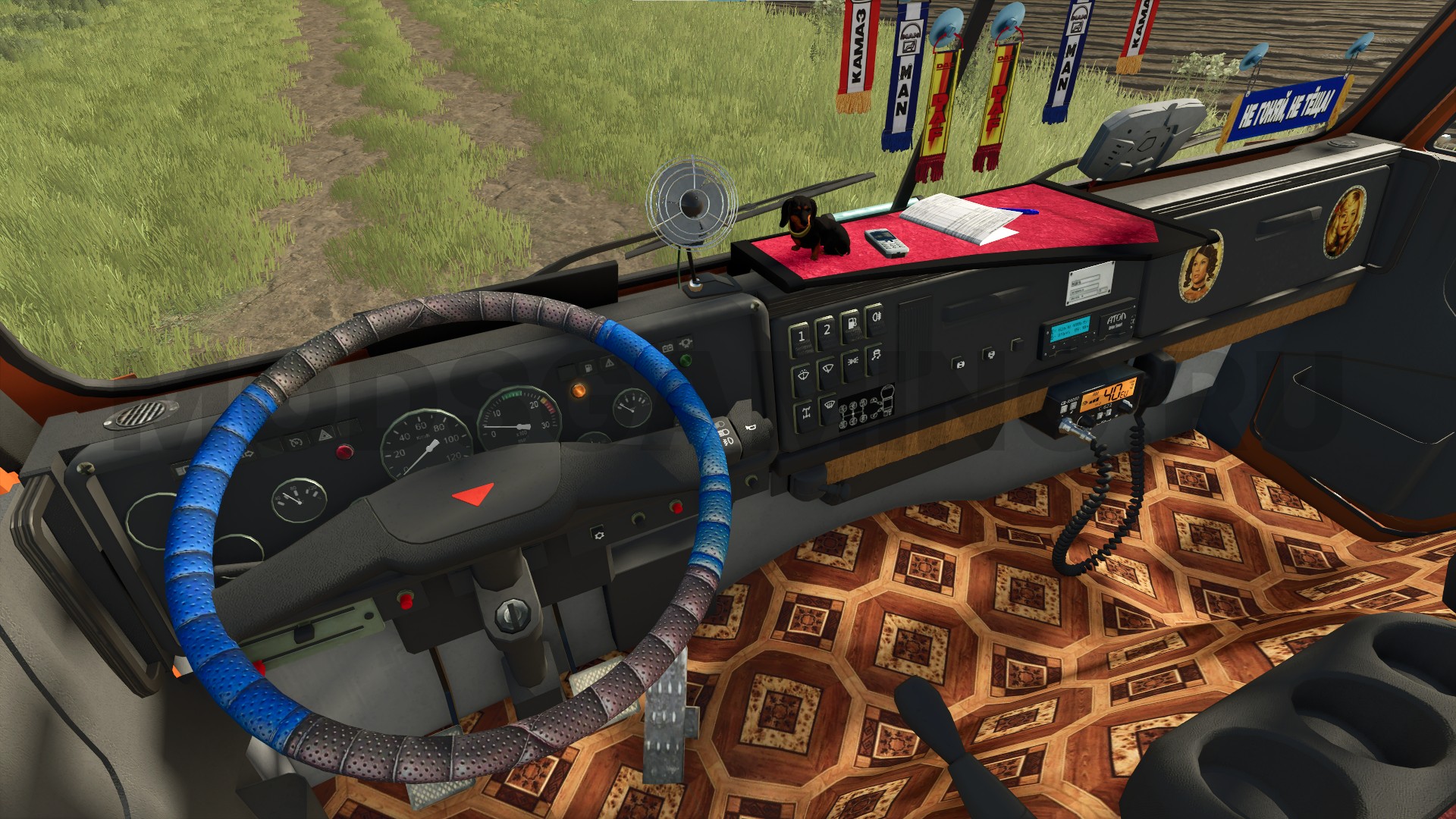 - Анимированная приборная панель, педали, рычаг КПП;