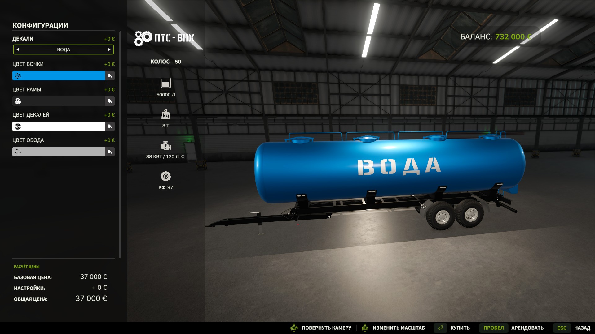 Бочка на 50 000 литров , Цена 37 000 , Выбор цветов : бочки , рамы , дисков и декалей , Выбор декалей : вода , топливо , молоко , жидкие удобрения , гебициды ( на русском языке ) , Шейдеры FS25 - грязь , намокание , износ . Автор мода: VitAmiN |
