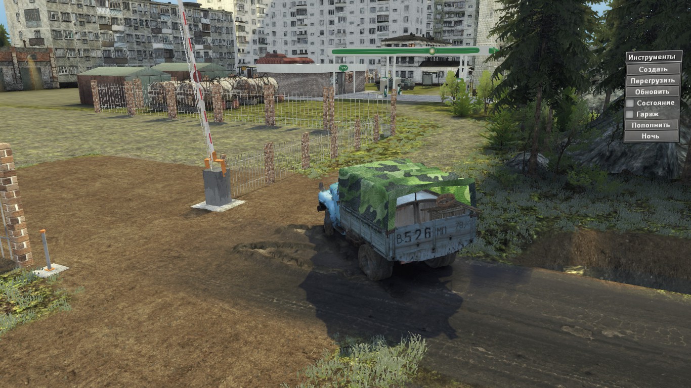 На карте: 1 гараж (закрыт) 1 лесоповал + точка ручной погрузки 1 АЗС 5 пилорам 2 машины + 4 слота
